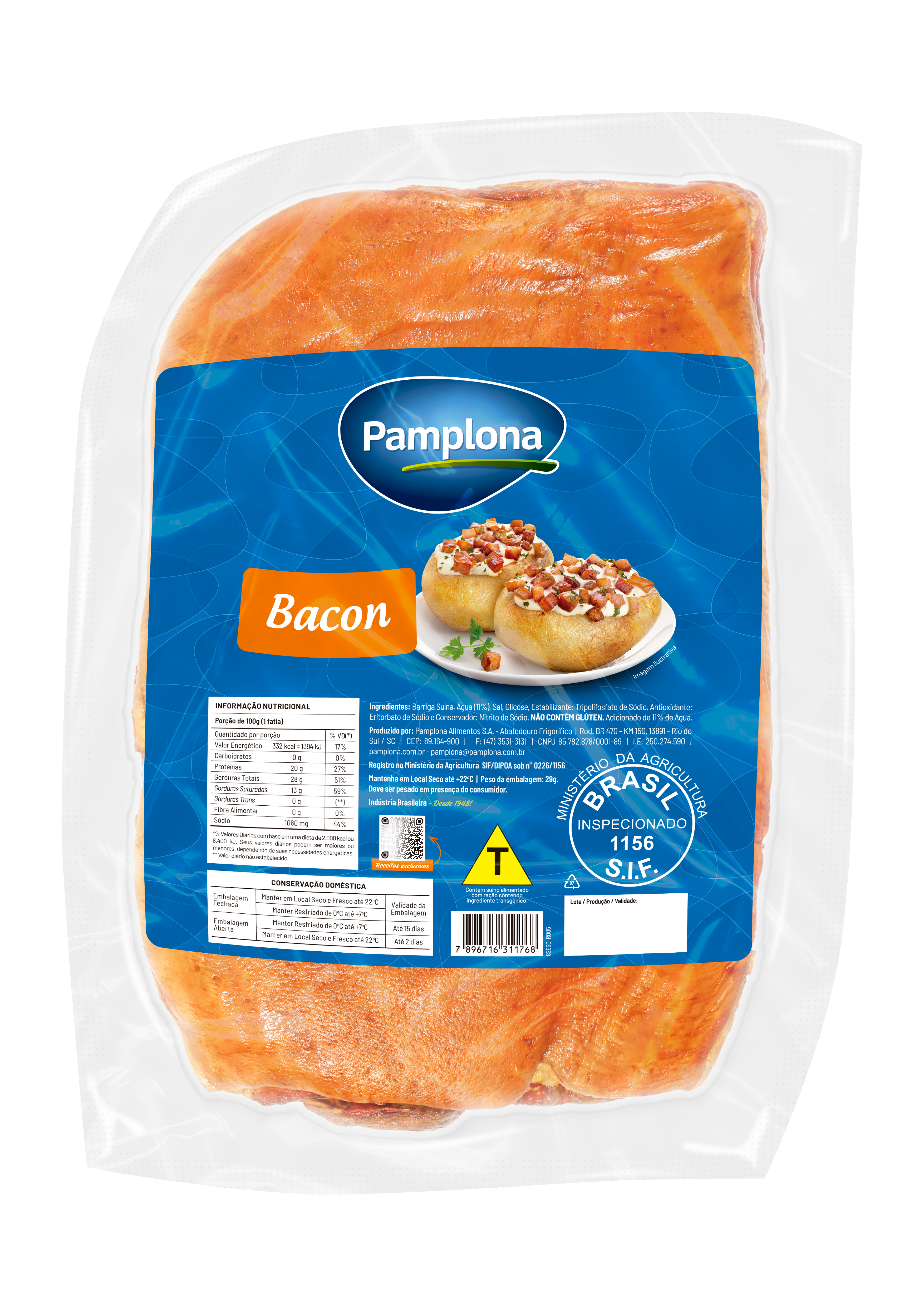 Bacon Manta Defumado Pamplona: peça inteira caixa com peso variável, defumação tradicional e alto rendimento. Ideal para quem busca flexibilidade no corte e uso.
