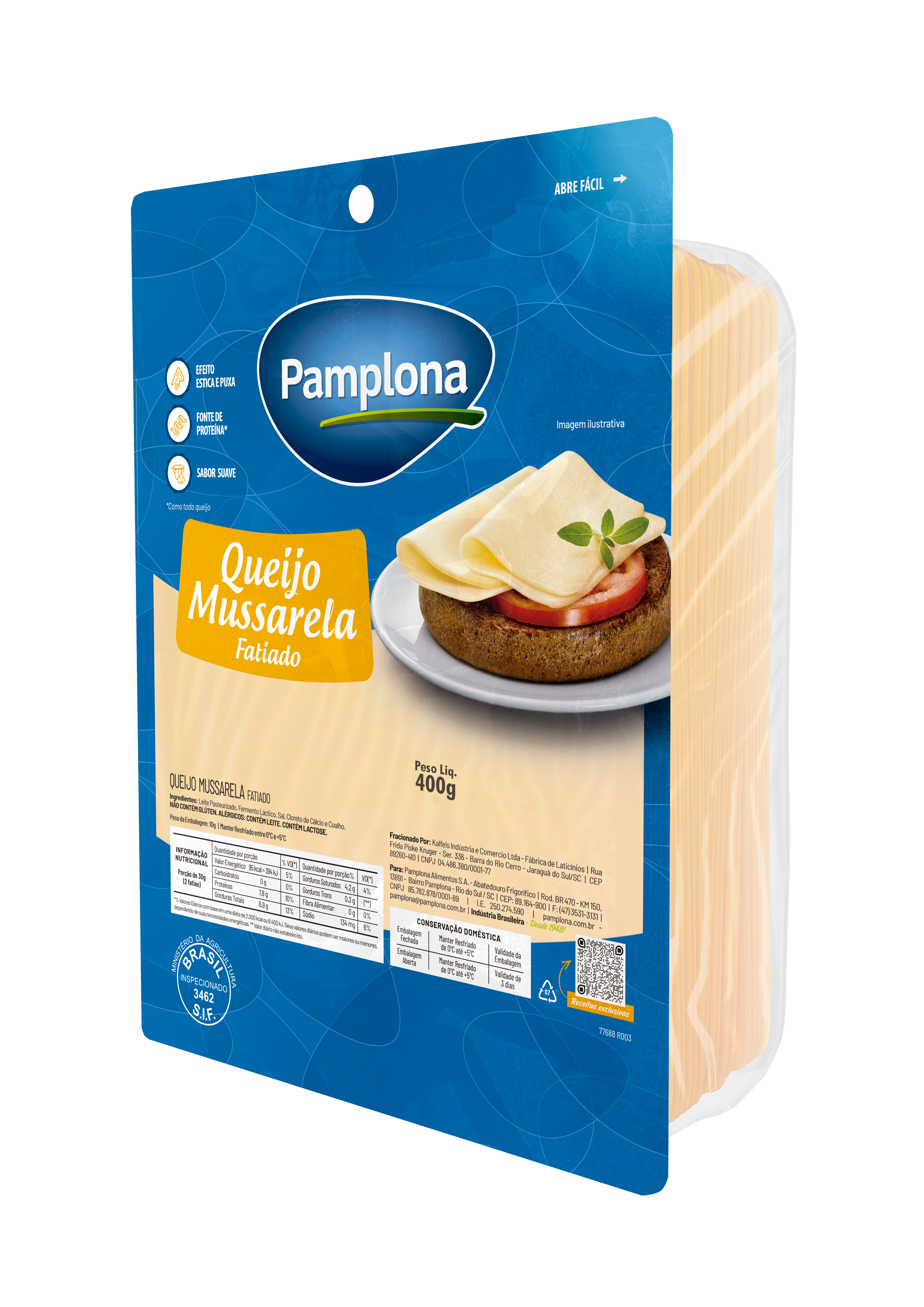 Queijo Mussarela Fatiado Pamplona: qualidade premium, fatias práticas e sabor suave. Ideal para o preparo de lanches, pizzas e receitas do dia a dia.